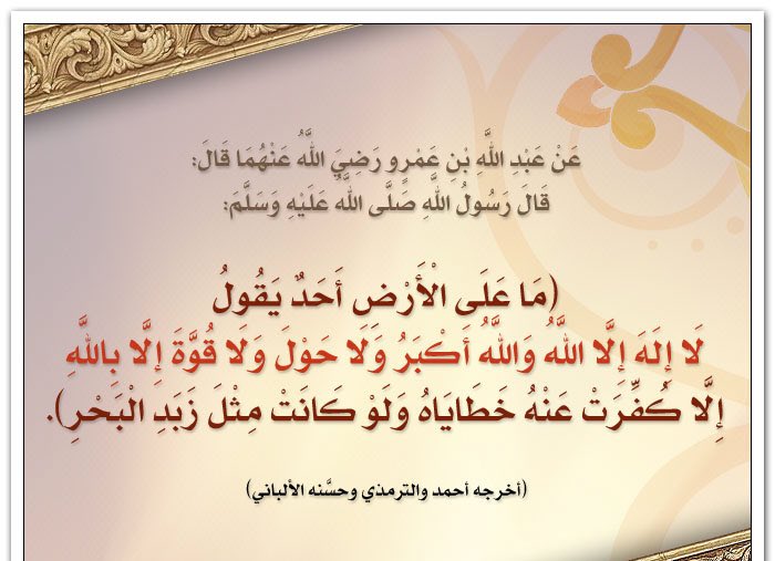 ما على الأرض أحد يقول لا إله إلا الله والله أكبر ولا حول ولا قوة إلا بالله إلا ك ف ر ت عنه خطاياه ولو كانت لفلي سمايل