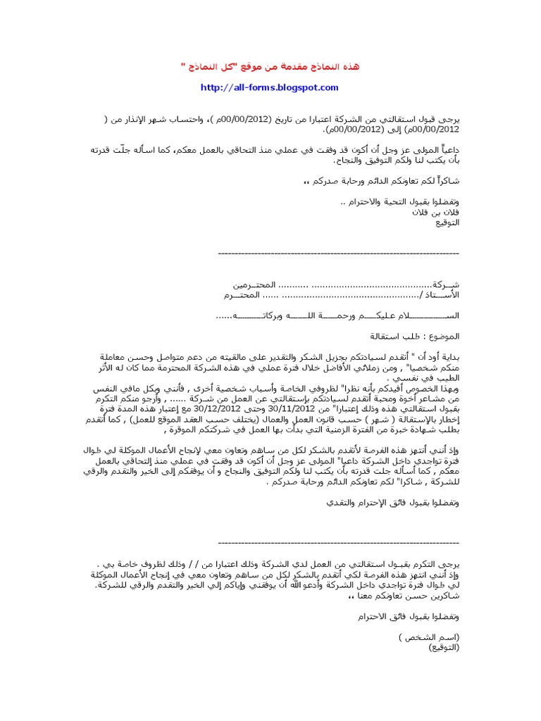 نموذج استقالة من شركة جاهز للطباعة موقع الجنة
