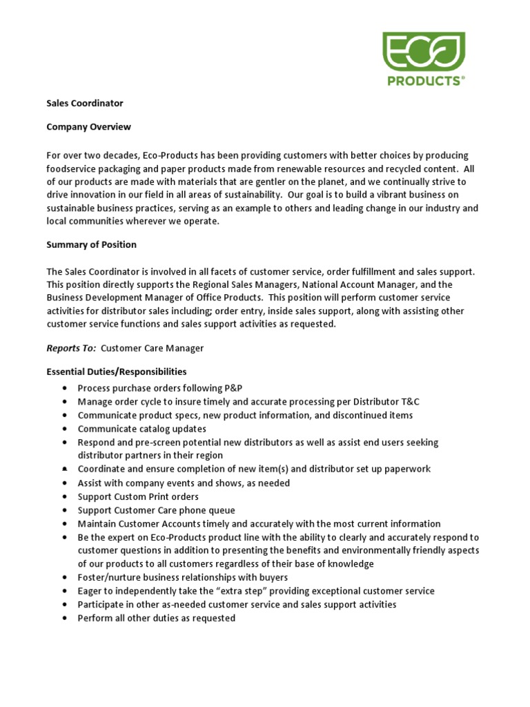 Sales Coordinator Company Overview Reports To Customer Care Manager Sustainability Sustainable Business
